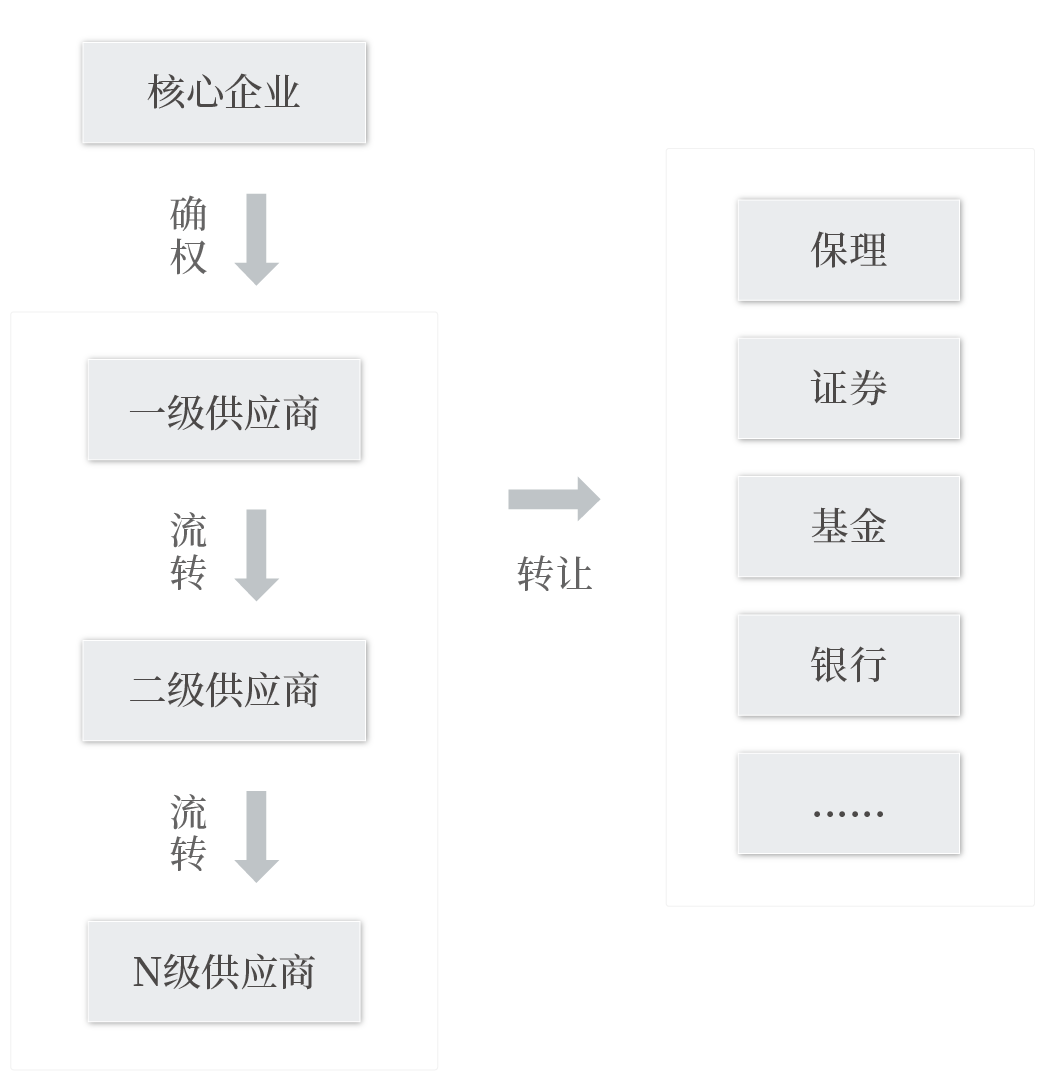 平台上具有优质商业信用的核心企业对到期的付款责任进行确认,各级供应商可将确认后的信用资产转让予上一级供应商以抵偿债务,或转让予机构受让方获得资金融通。