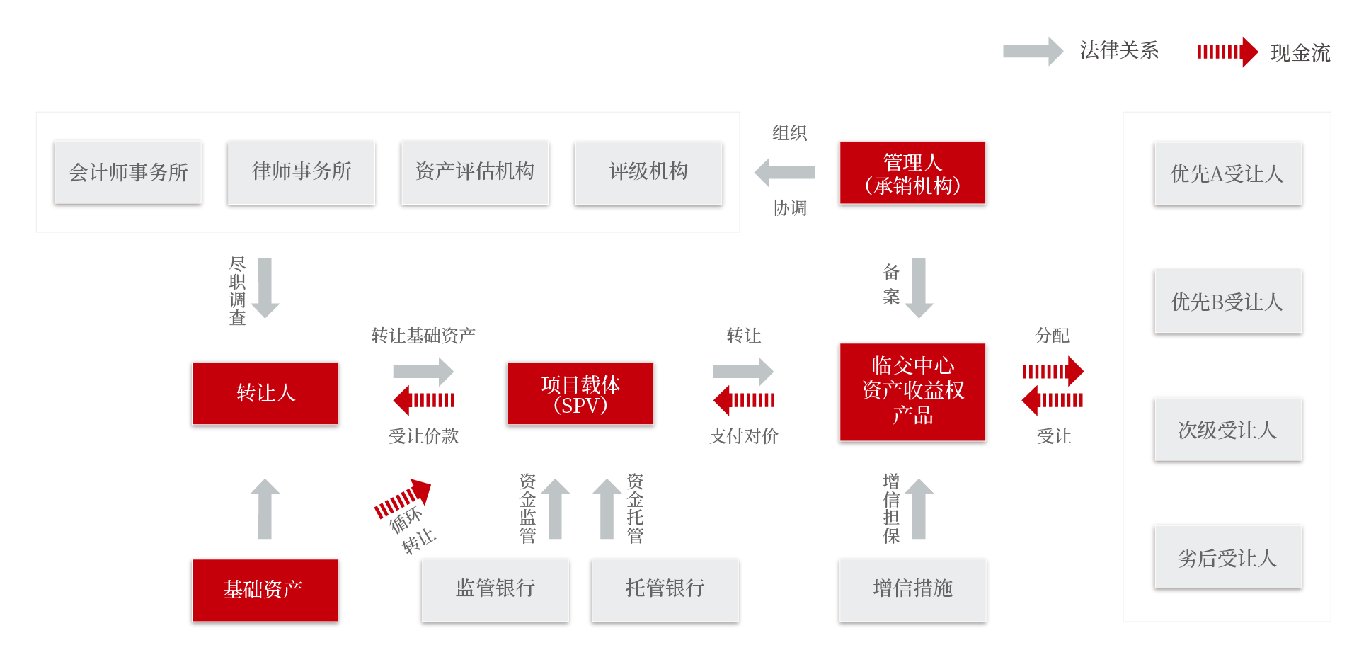 【产品结构】转让人将现在或未来能够产生现金流的资产组合形成基础资产,并引入担保、评级机构对资产收益权产品进行担保和信用评级,同时会计师事务所和律师事务所、专业金融机构(如证券公司等)分别作为专业服务机构、项目的推荐机构,共同对基础资产进行实质性审核和推荐。